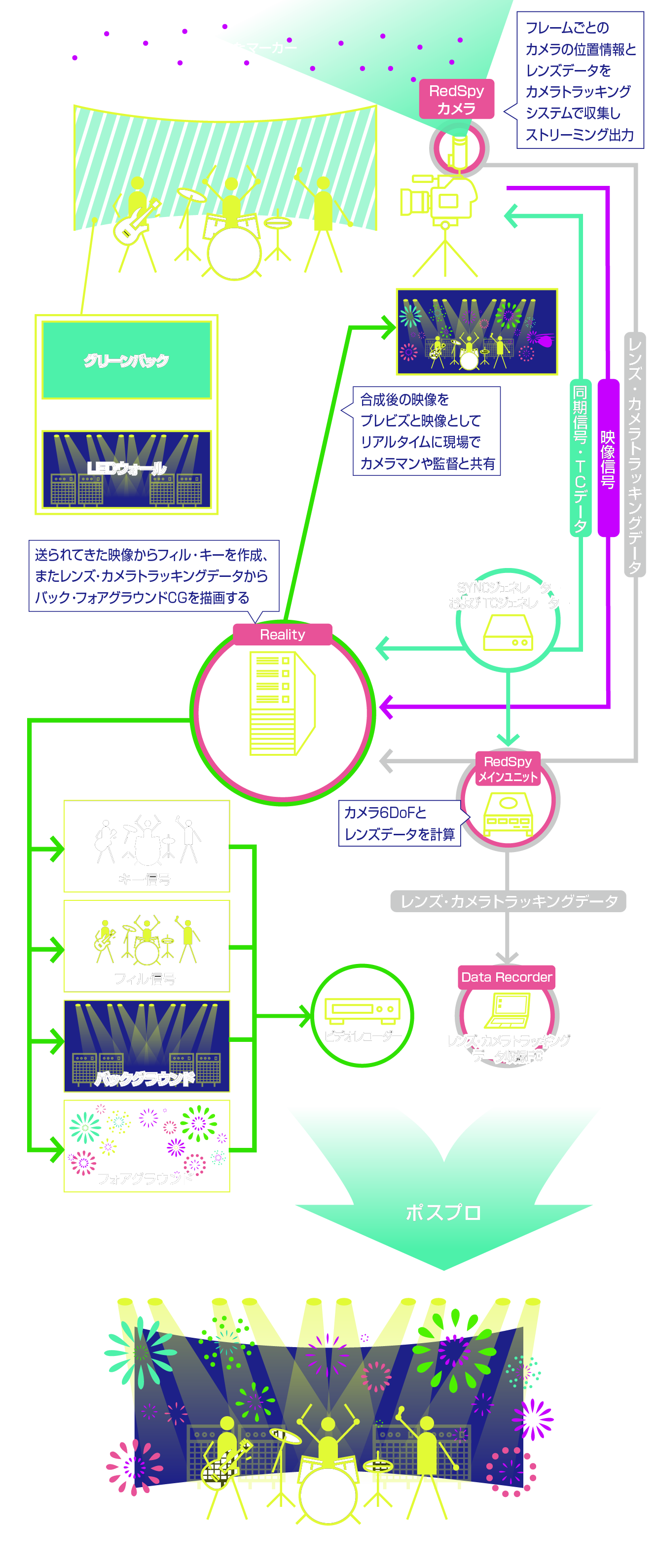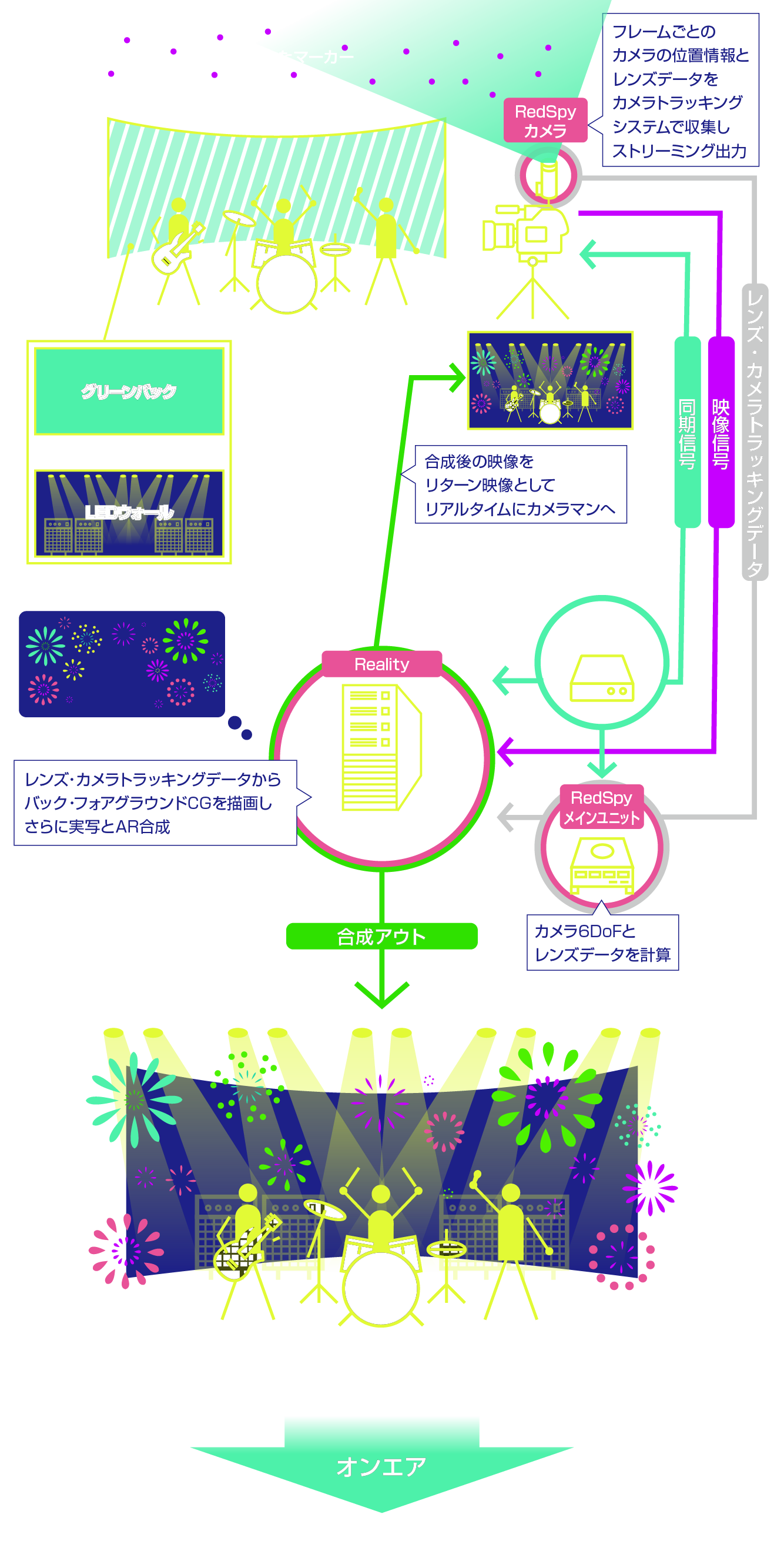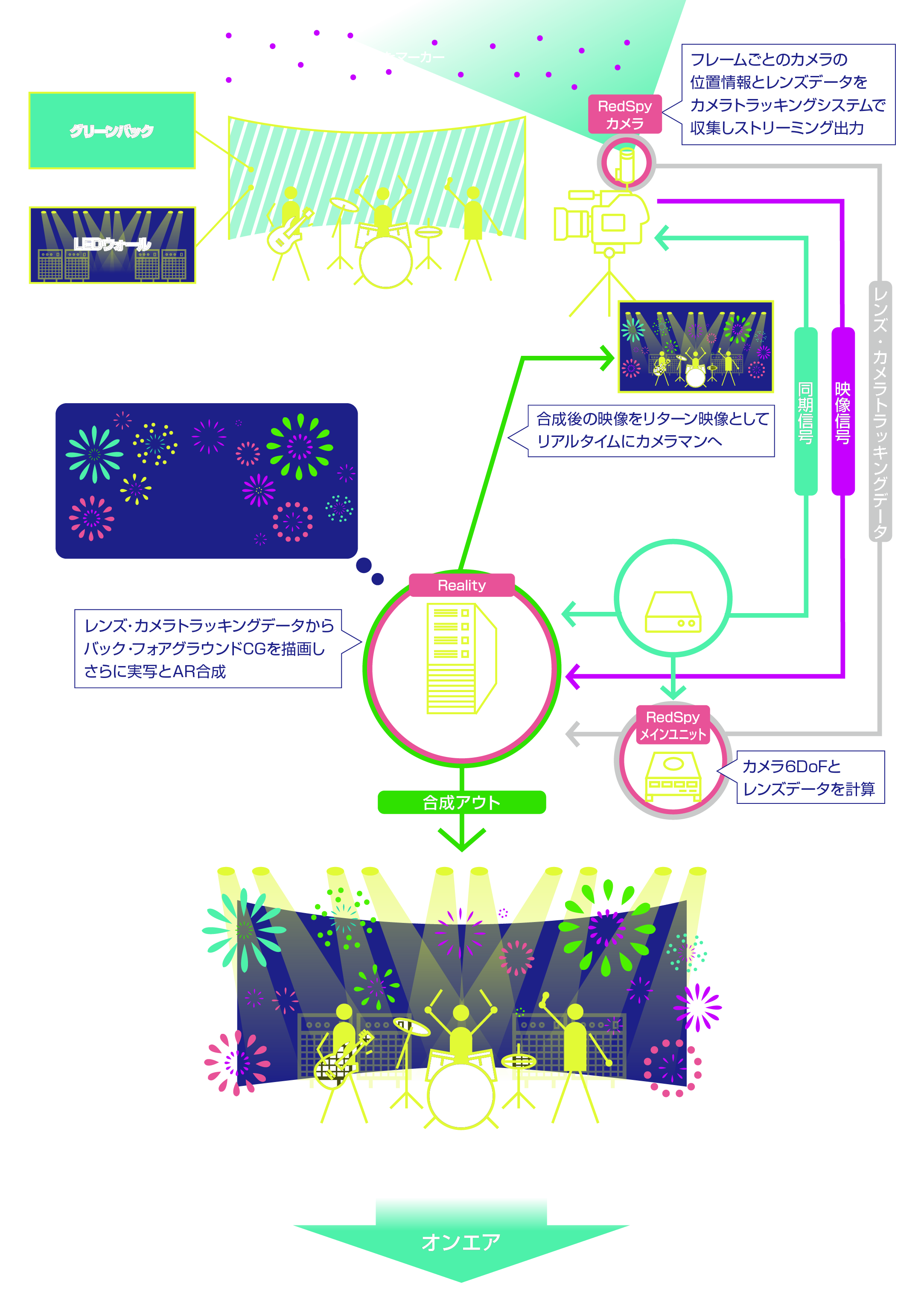 Realityはライブ配信の現場で高画質リアルタイムCG合成を実現しリッチな映像演出を実現します。また、グリーンバック撮影の現場で合成結果をリアルタイムに確認できるプレビズ用途にも対応します。LEDウォールを背景に使用した撮影では、LEDの背景と実景、前景(フォアグラウンド)を合成し、ライブ環境で複雑なxR演出を行えます。RedSpyなど各種のカメラトラッキングシステムとの親和性が高く、システムアップすることで映像表現の可能性が広がります。