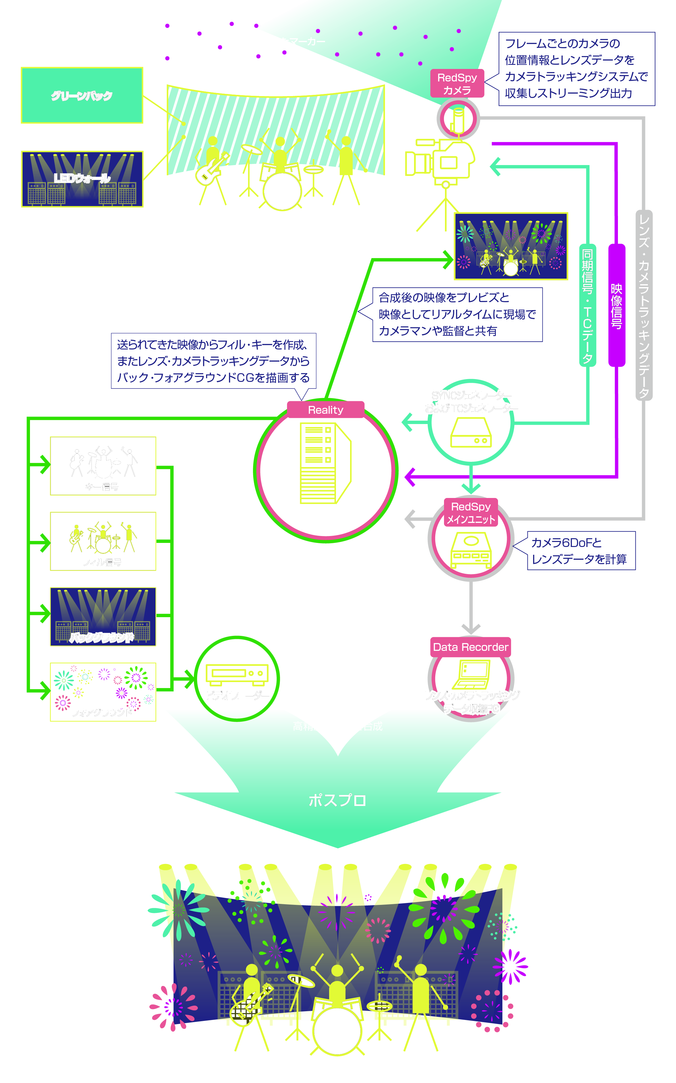 ポスプロ処理を必要とする収録現場においても、Realityとカメラトラッキングシステムをシステムアップすることで、映像の収録とともに高精度なカメラのトラッキングデータ、レンズデータの収録が行え、ポスプロでの作業にも対応します。クリエイターからの高度な要求に応え効果的な映像演出を実現します。