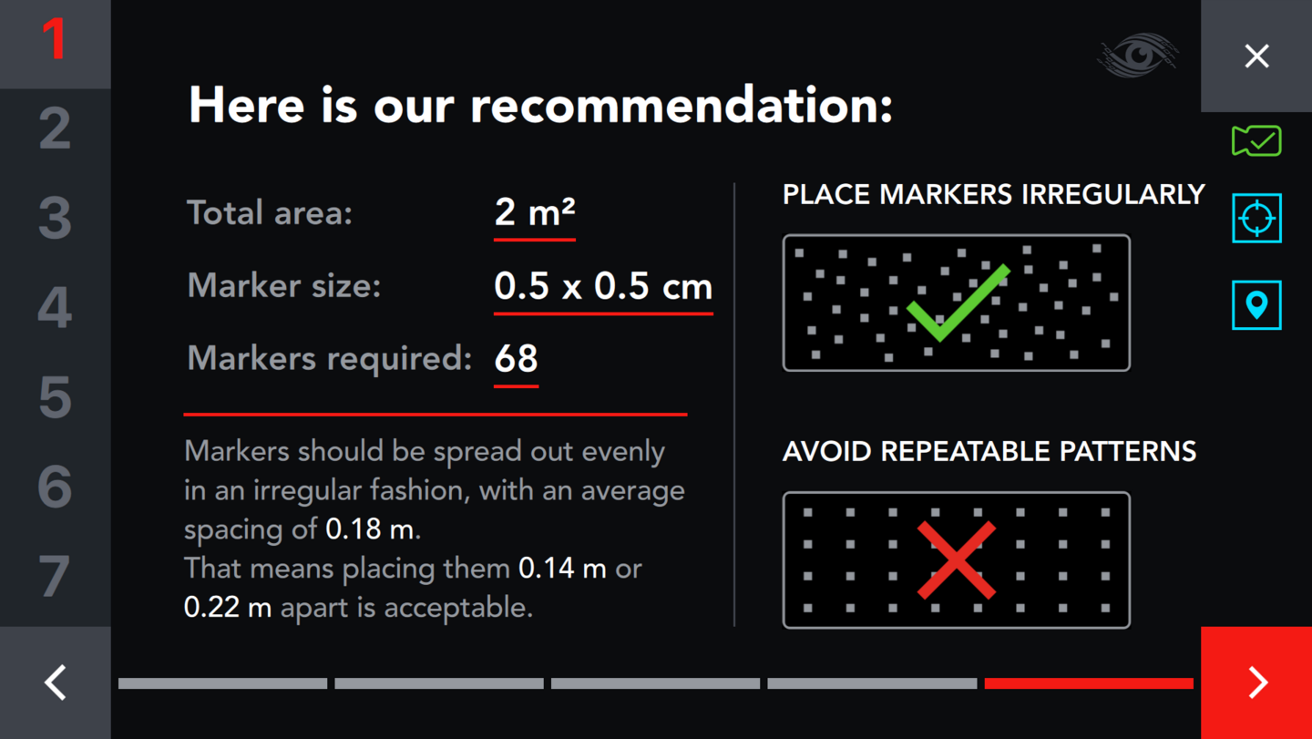 RedSpyの操作は、付属する制御用タッチモニター*1で行います。わかりやすいメニュー構成と優れたユーザーインターフェースで、オペレーターを選ぶことなく運用が可能です。また、環境条件を入力するだけで、RedSpyを運用する現場に合わせた運用に必要なマーカー情報の提案を受けられるため、迷うことなく確実なトラッキングが行えます。